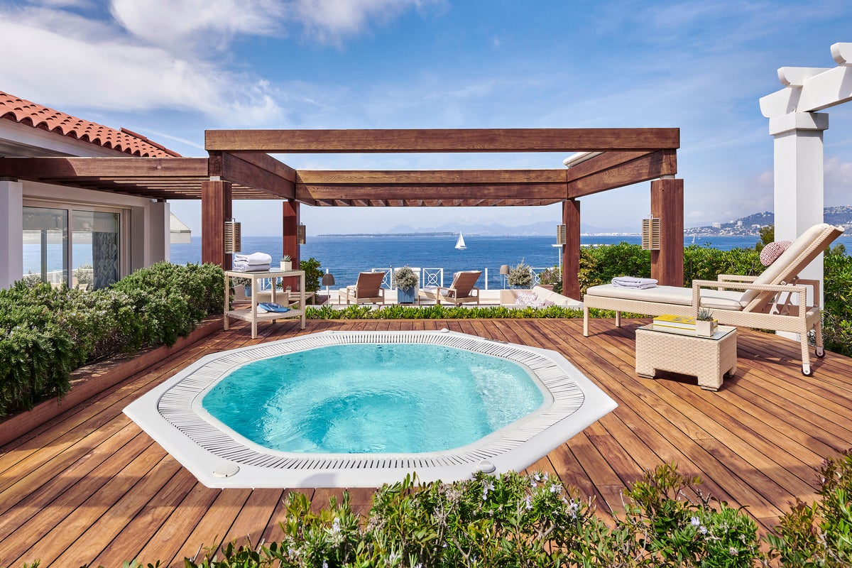 This is the hotel’s top room and comes with a 2,152-square-foot rooftop terrace, complete with hot tub, and jaw-dropping views over the Mediterranean and the Lérins Islands.